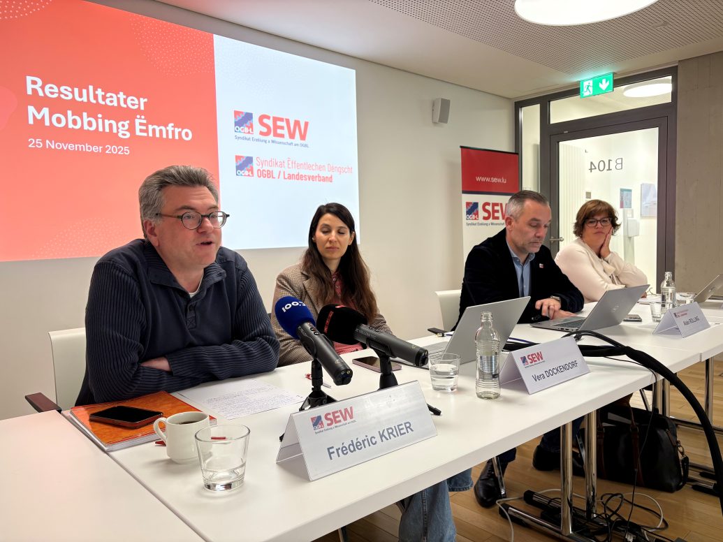 Schließlich haben die beiden Syndikate zwischen Juni bzw. Juli und September 2025 Umfragen unter ihren Mitgliedern durchgeführt, um sich einen Überblick über das Ausmaß des Phänomens zu verschaffen. 617 Personen nahmen an der Umfrage des SEW/OGBL teil und 313 an der Umfrage des Syndikats Öffentlucher Dienst, also insgesamt 930 Personen. Die Ergebnisse der Umfrage wurden im Rahmen einer neuen Pressekonferenz am 25. November 2025 vorgestellt.